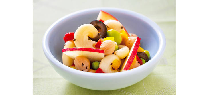 「ケンコーマヨネーズ」の豆サラダ関連商品は2019年、前年比で約10%アップするなど、健康的な豆サラダへの関心が高いことがわかります。こちらは、カヴァタッピマカロニ、ひよこ豆や枝豆、ブラックオリーブ、黄・赤ピーマンの6種の素材に、オリーブの風味が広がるシンプルな味わいが特徴。見た目も華やかで食卓の副菜にもってこいですね。