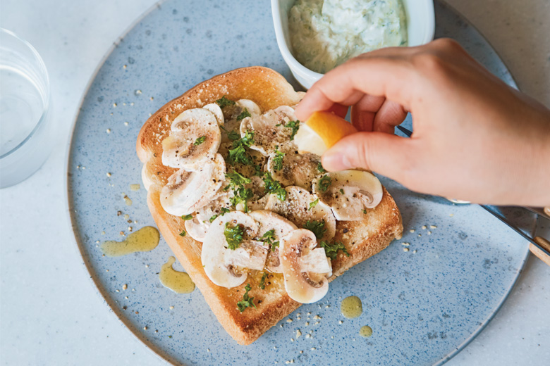 2 1の食パンにマッシュルームをのせてAを順にふる。レモンを絞り、オリーブ油を回しかける。