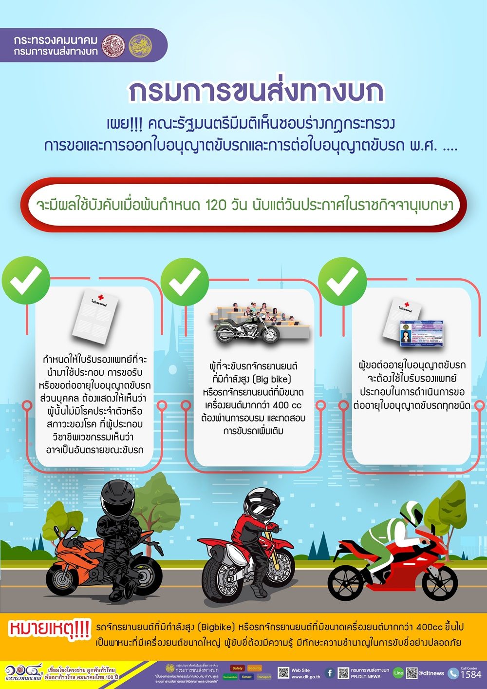 กรมการขนส่งทางบก เผย!!! คณะรัฐมนตรีมีมติเห็นชอบร่างกฎกระทรวงการขอและการออกใบอนุญาตขับรถและการต่ออายุใบอนุญาตขับรถ พ.ศ. …. ผู้ขับรถจักรยานยนต์ Big bike ต้องผ่านการอบรมและทดสอบการขับรถเพิ่มเติมจะมี ผลใช้บังคับเมื่อพ้นกำหนด 120 วัน นับแต่วันประกาศในราชกิจจานุเบกษา