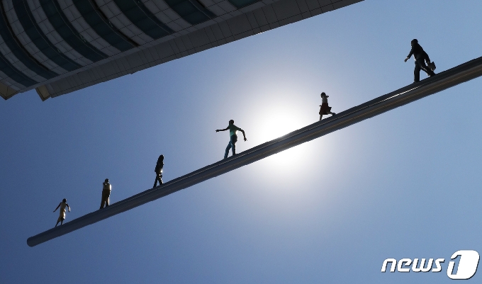 | 맑은 가을 날씨를 보인 18일 서울 강서구 한 빌딩에 설치된 조너선 보로프스키(Jonathan Borofsky)의 '하늘을 향해 걷는 사람들(walking to the sky)' 작품 위로 파란 하늘이 펼쳐져 있다. 2020.9.18/뉴스1 © News1 송원영 기자 |
