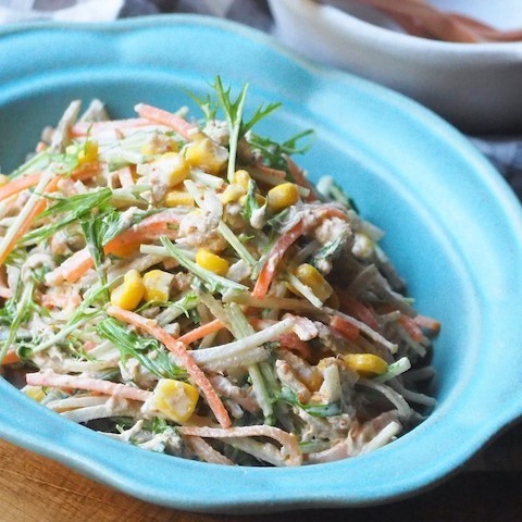 ごぼうサラダの味バリエを知っておけば、これからの季節に活躍する副菜が増えますね。シャキシャキ食感のごぼうにプチプチ食感の明太子を合わせたり、甘みのあるコーンを合わせたりと、お好みの一品を見つけてみて。