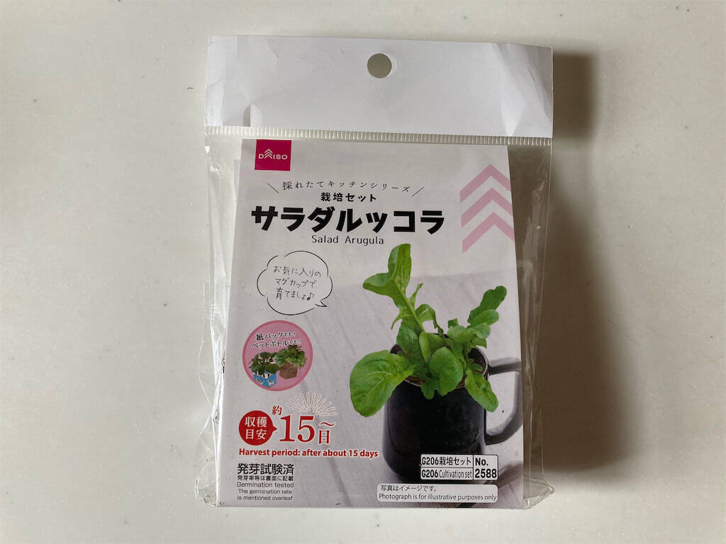 購入したのは、ダイソーの栽培セット「サラダルッコラ」。100円(税抜き)商品です。