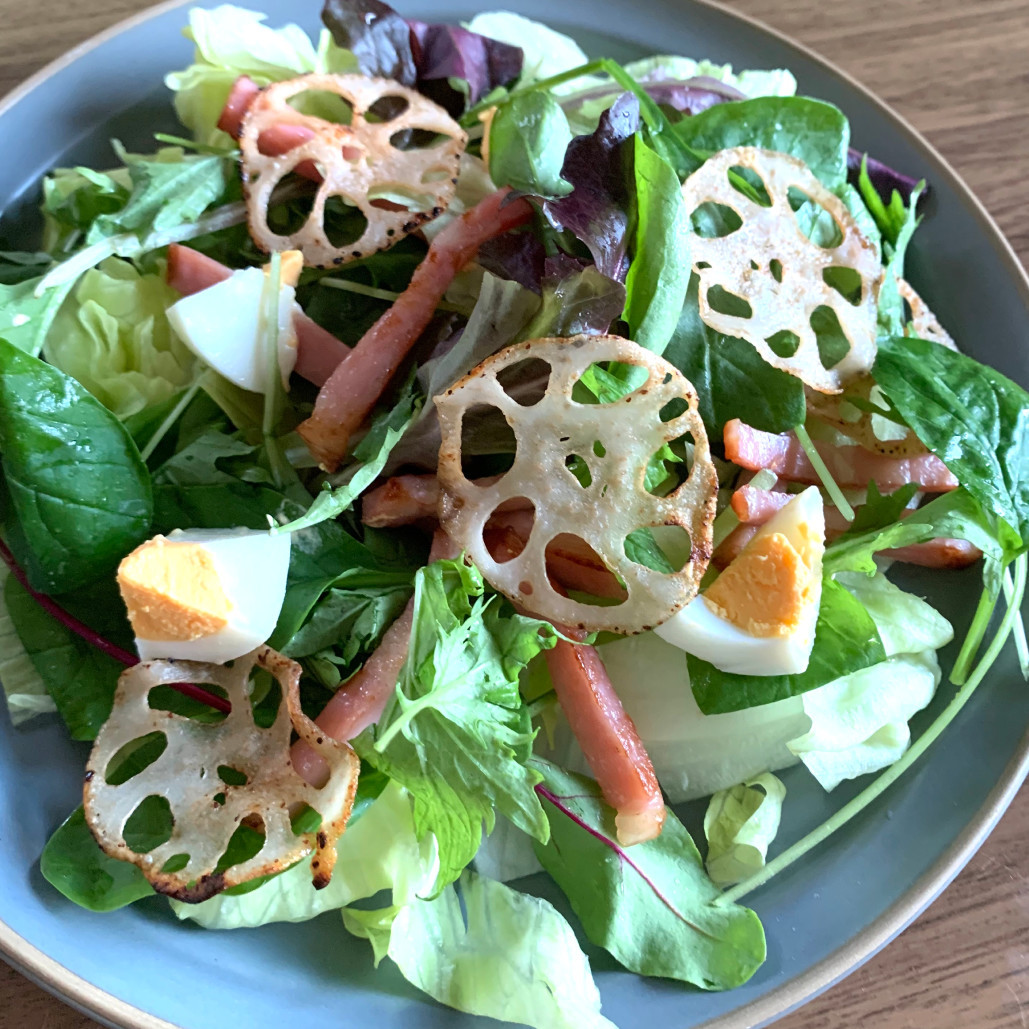 ベーコンとれんこんがアクセント「ベビーリーフのサラダ」