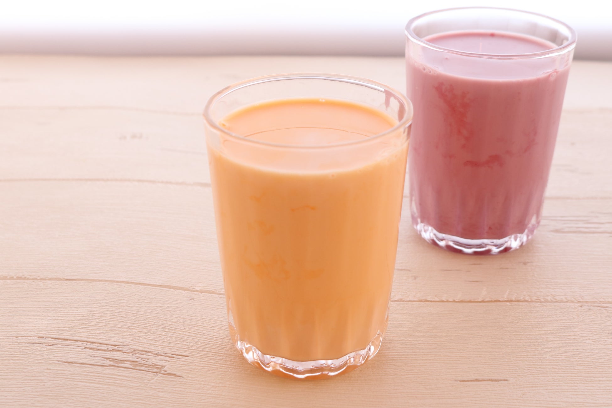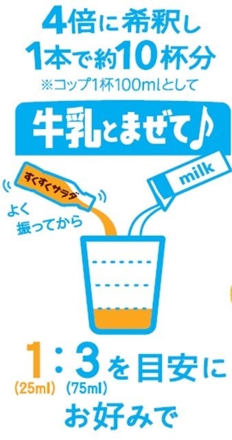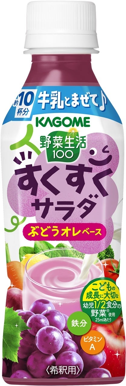 「野菜生活100すくすくサラダ」は、牛乳と混ぜて飲む希釈タイプの野菜果実ミックス飲料です。幼児1/2食分の野菜(※)を使用しており、子どもの成長に大切な栄養(バナナオレ:食物繊維・ビタミンA・ビタミンC、ぶどうオレ:鉄分・ビタミンA)を摂ることができます。バナナ味とぶどう味で牛乳と一緒に野菜をおいしく摂れるので、野菜を食べさせるのに苦労する忙しい朝にぴったりの新商品です。お好みの濃さに調整でき、牛乳以外にもヨーグルトや豆乳と合わせるなど、様々なアレンジも楽しみながら、子どもの成長をサポートいたします。