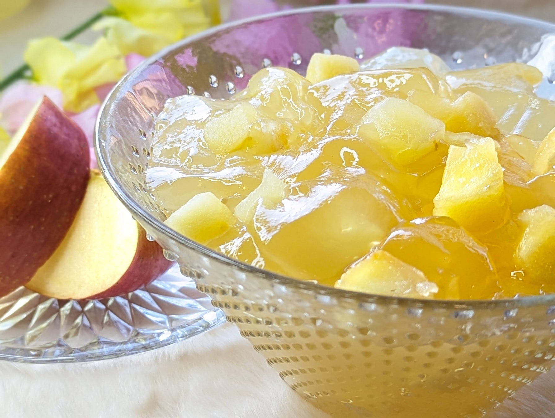 青森県産つがるりんごのシロップを使用し、中にはシャキシャキ食感のりんご果肉を合わせた、爽やかな甘さのゼリーです。