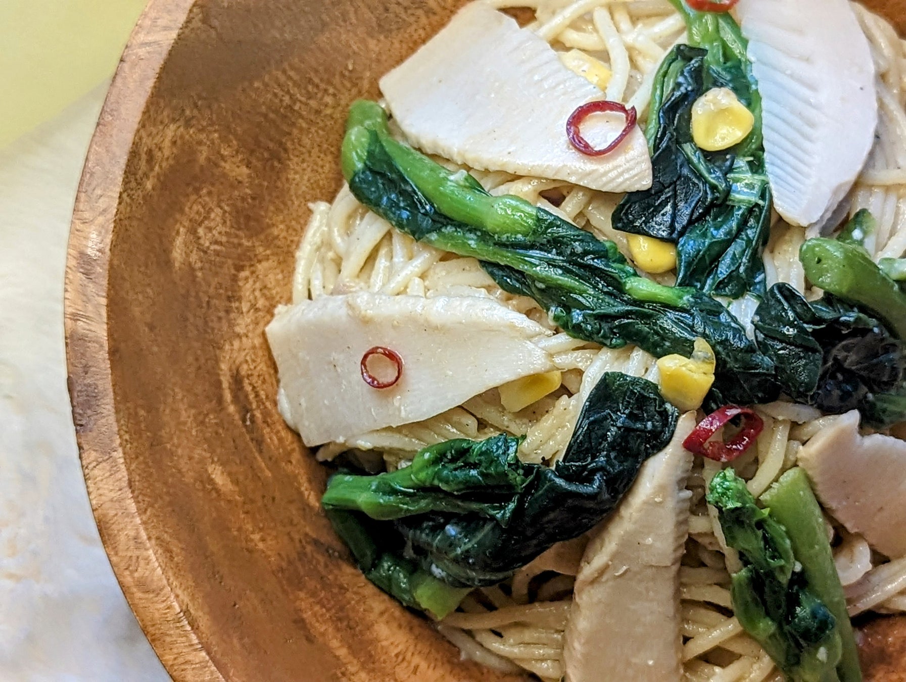 春の訪れを告げる菜の花と筍を、たっぷり楽しめます。口に入れた瞬間にんにくが香り、卵のまろやかさが絡み合うペペロンチーノのパスタサラダです。