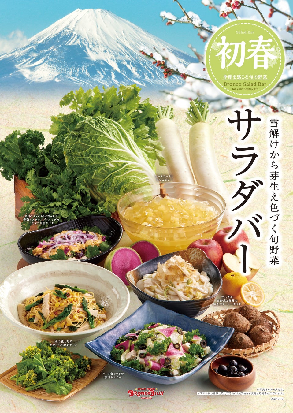 ステーキハウス ブロンコビリーを全136店舗展開する株式会社ブロンコビリー(本社:愛知県名古屋市 代表取締役社長:竹市 克弘)は、1月19日(金)より季節限定『初春サラダバー』の提供を開始します。冬から春にかけて楽しめる、冬野菜の甘みや、初春ならではのほろ苦さや爽やかな香りをお楽しみください。
