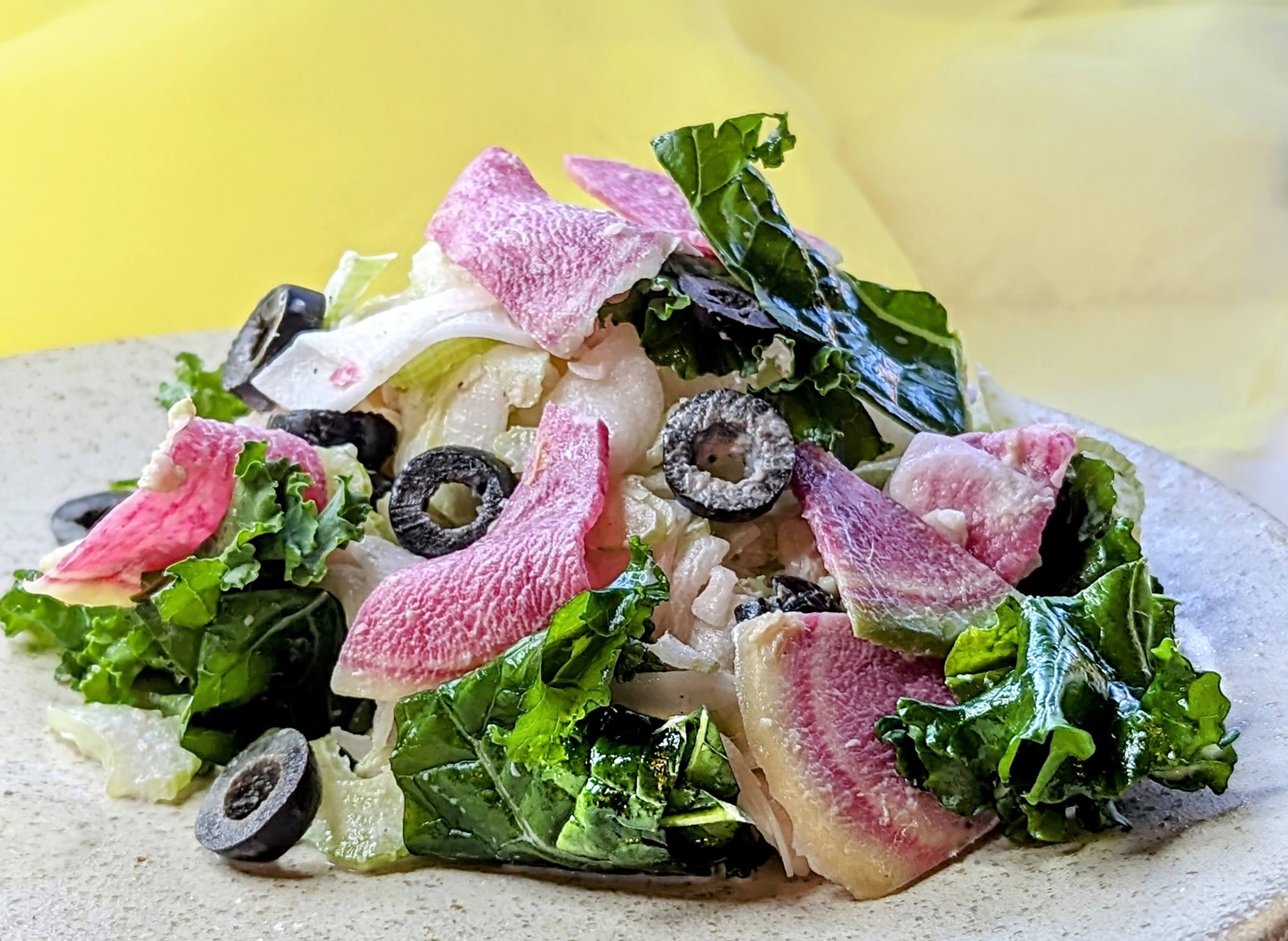 カーリーケールがたっぷり入り、旬野菜のセロリの香りが爽やかです。冬に甘みが増す2色の大根がツナソースとよく合い、オリーブの塩味がアクセントの、冬と春を同時に楽しめるサラダです。